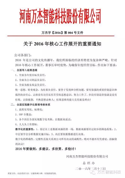 送走了不平凡的2015,迎來(lái)了嶄新的2016。萬(wàn)杰智能科技股份有限公司于2016年2月13日(農(nóng)歷正月初六)正式開(kāi)工。一年之計(jì)在于春,現(xiàn)在zui重要的是做好新年的各項(xiàng)工作,努力完成今年各項(xiàng)目標(biāo)任務(wù),推動(dòng)核心工作再上臺(tái)階。 2016年,是萬(wàn)杰智能的文化傳播年,我們所面臨的經(jīng)濟(jì)形勢(shì)更為復(fù)雜和嚴(yán)峻。董事長(zhǎng)王曉杰審時(shí)度勢(shì),為確保年度經(jīng)營(yíng)目標(biāo),針對(duì)2016年核心工作展開(kāi)提出兩個(gè)全面要求: 一、全面導(dǎo)入結(jié)果思維:為年度目標(biāo)負(fù)責(zé)任、為公司利益負(fù)責(zé)任、為股東收益負(fù)責(zé)任。 二、全面實(shí)現(xiàn)數(shù)字化管理考核體系:做到流程實(shí)用化、標(biāo)準(zhǔn)化;ERP全覆蓋;以數(shù)據(jù)來(lái)說(shuō)話;人人頭上有指標(biāo),絕對(duì)不能再有憑感覺(jué)、拍腦袋的決議。 在2016年萬(wàn)杰智能全體同仁應(yīng)以更加飽滿的熱情投入到工作中,盡快地進(jìn)入工作狀態(tài),更要發(fā)揮兢兢業(yè)業(yè)、一絲不茍的精神,腳踏實(shí)地,忠實(shí)履行崗位職責(zé),以更大的熱情向前邁進(jìn)。 2016年務(wù)必要做到:多建議、多欣賞、多檢討! |