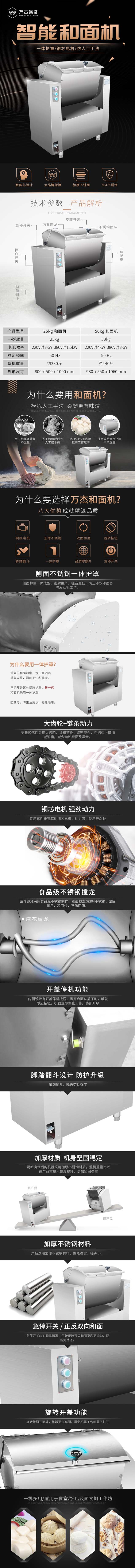 WJ-HMJ25、WJ-HMJ50A型低噪音全不銹鋼和面機廣泛適用于工廠、機關、部隊的食堂,各大賓館、飯店、餐廳、食品生產加工單位、包子饅頭生產加工作坊等,是替代手工,降低勞動強度,滿足廣大民眾飲食衛生的理想設備,同時也可用于其它類似物料的混合與攪拌。