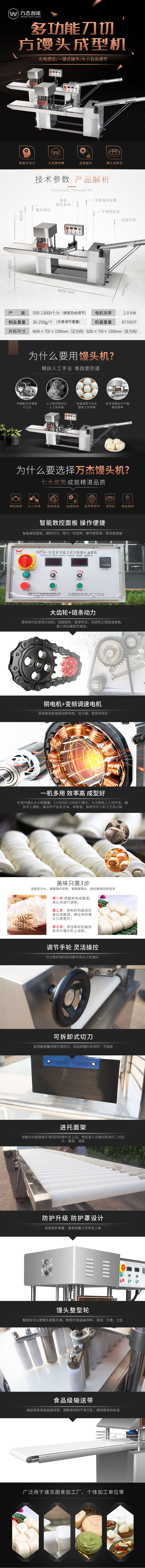 DMT90-VII系列數控多功能方形饅頭成型機廣泛適用于速凍面食加工廠,主要用來生產刀切饅頭及花色點心。
