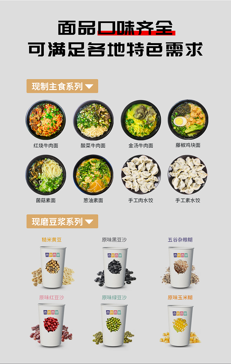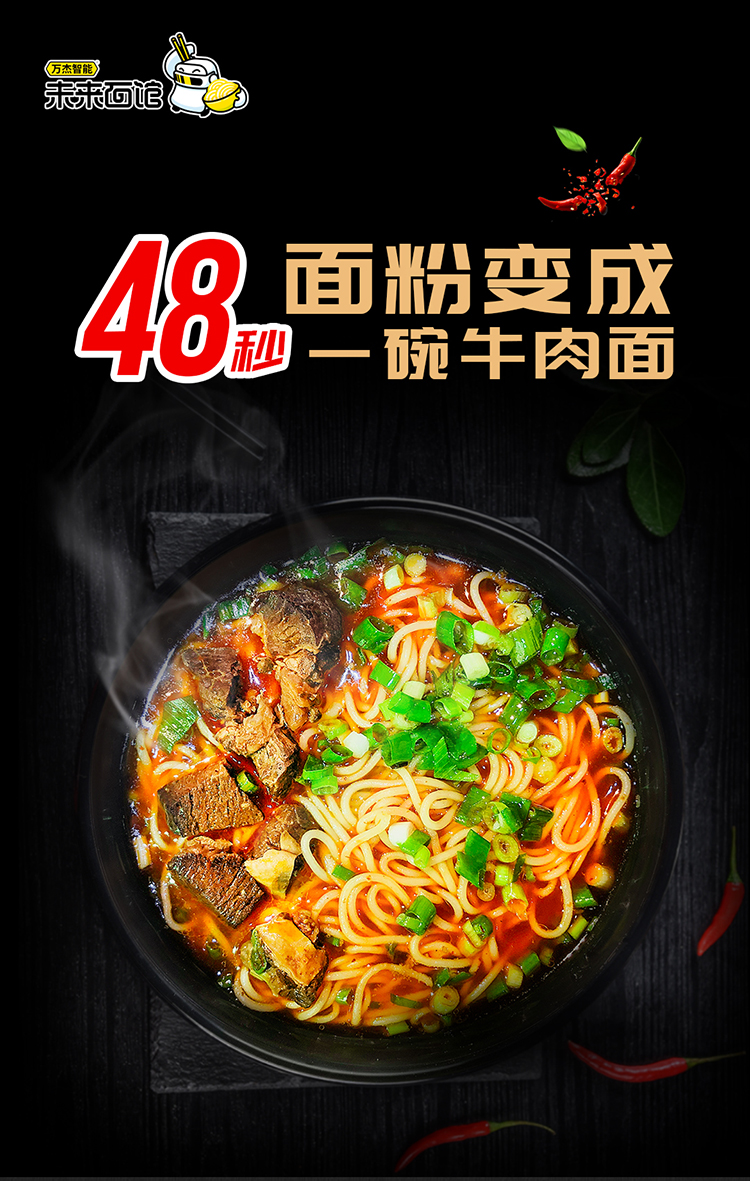 • 可以實現24小時不間斷供應面、水餃、五谷飲品、飲料等;